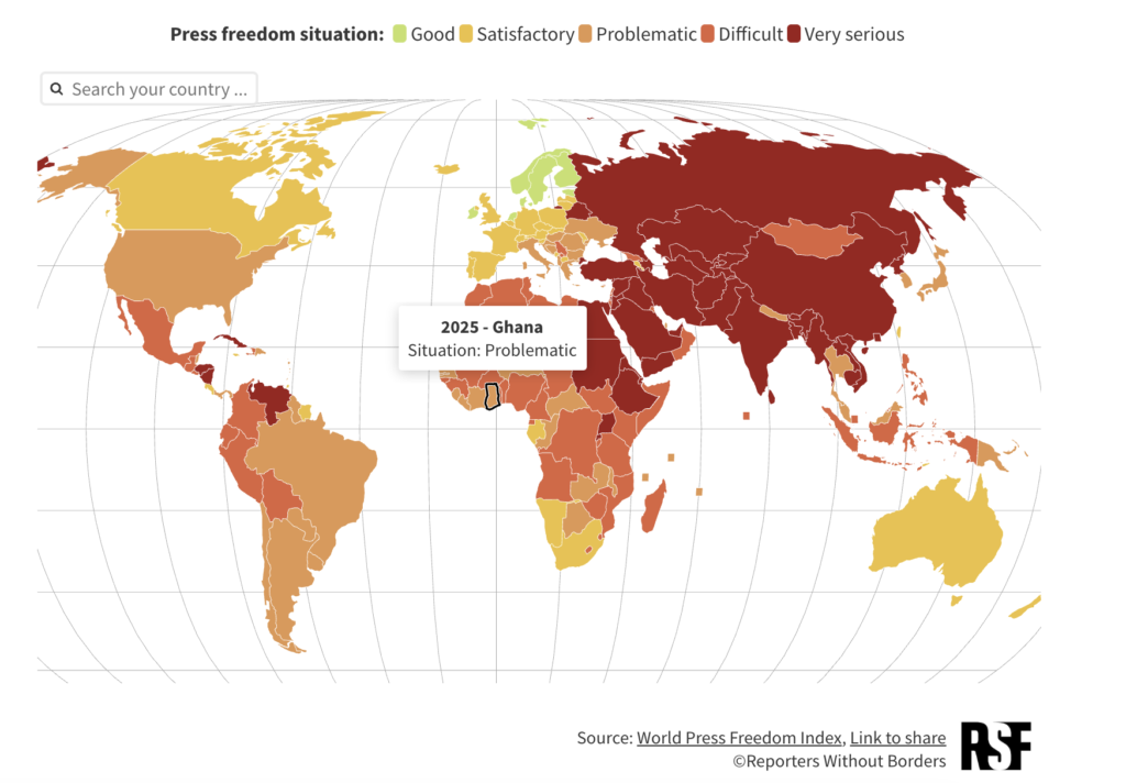 Reporters Without Borders ranked Ghana 52nd out of 180 countries on its 2025 Press Freedom Index — a slide from 50th the year prior. That ranking still looks generous. A number cannot capture the daily texture of a press corps that knows what it will and will not say before a politician finishes speaking.