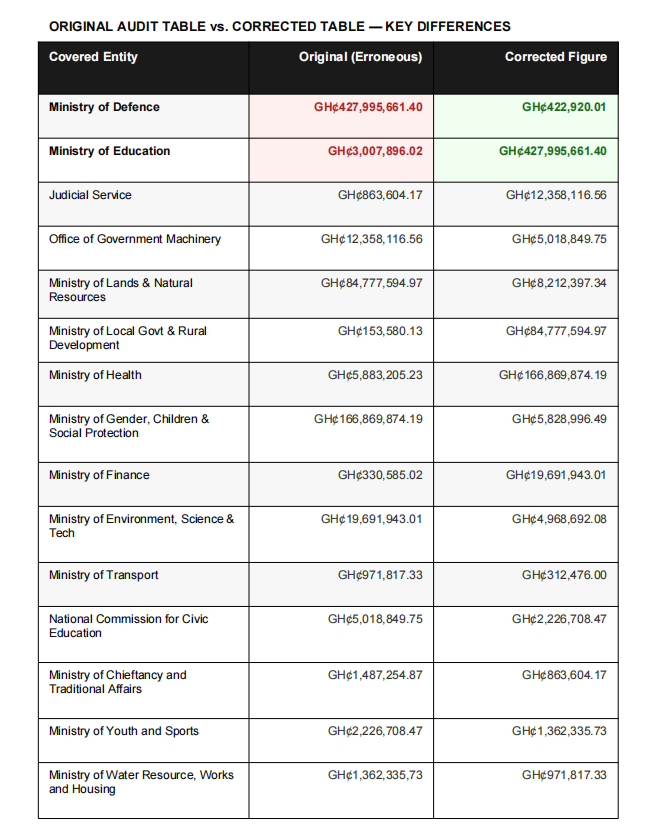 - The Audit Service has since admitted to a “transpositional error”: the GH¢427 million figure actually relates to 3,476 unaccounted staff at the Ministry of Education, not Kpodo