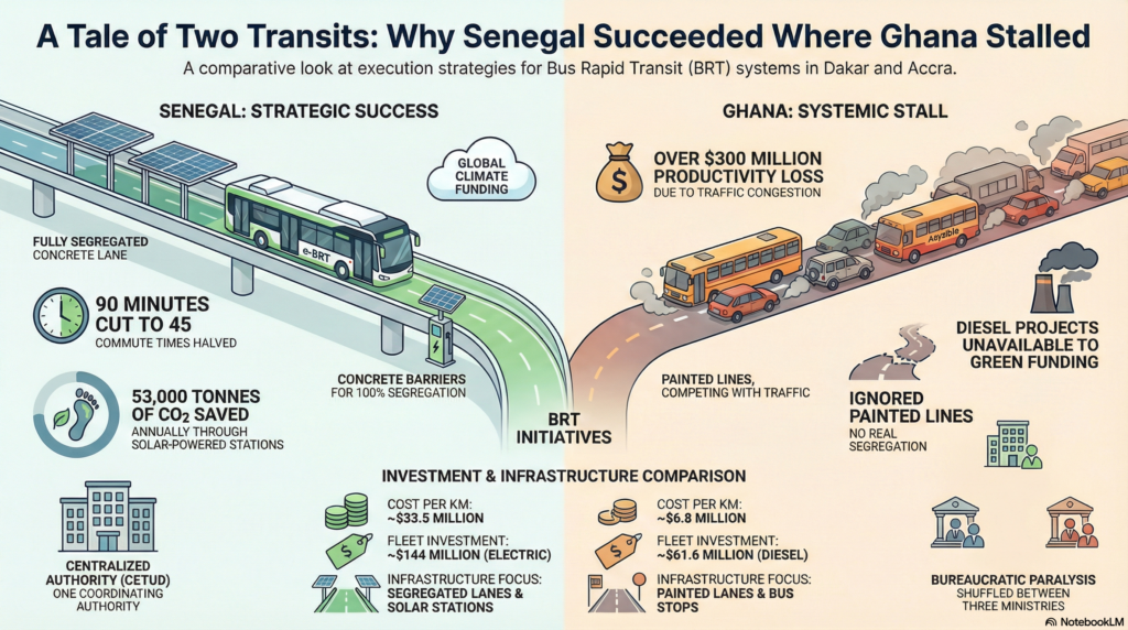 Planners in Senegal were able to physically separate their BRT lanes using concrete barriers. In Accra, “dedicated” lanes were often just painted lines that private cars ignored, rendering the buses useless during peak hours.