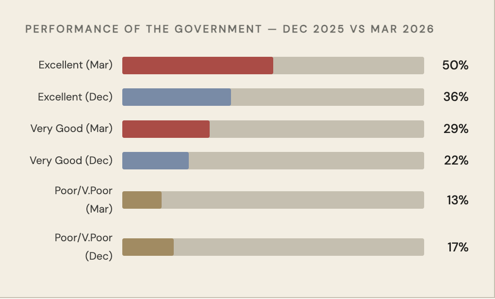 At every tier of the performance scale, the trend moved in the government’s favour. The “Average” rating — the middle ground — held broadly stable, edging from 22% to 11%, suggesting that many voters who previously sat on the fence have shifted to more clearly positive assessments.