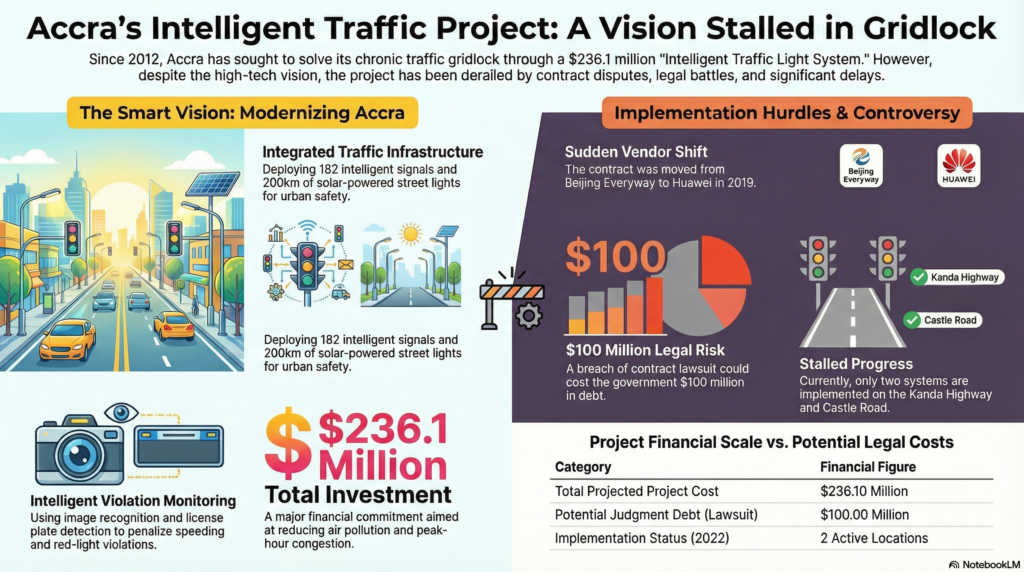 The “Smart Traffic Management System,” which was officially inaugurated in 2020, promised to end the legendary gridlock of Accra.